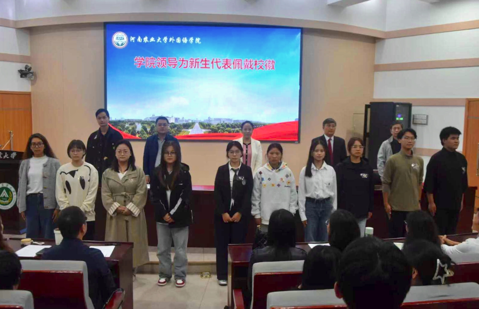 领导为新生代表佩戴校徽,象征新生正式融入外院大家庭、开启学业新征程。