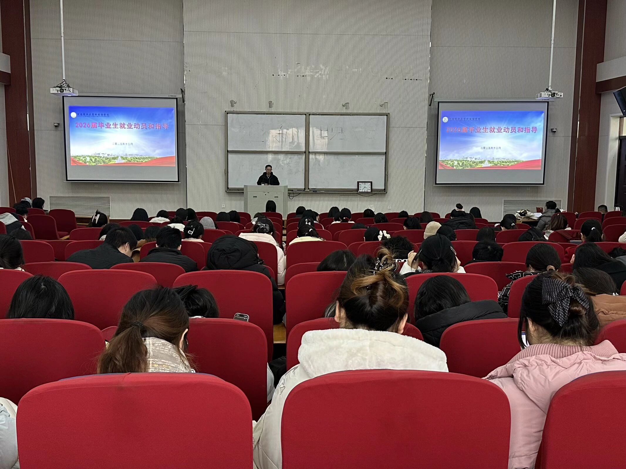 本网讯(审稿:张玥 供稿:侯彦冰 单梦梦)为扎实推进毕业生就业创业工作,引导学生做好实习准备、明确职业方向,12月30日下午,东京热在线 于龙子湖校区大教室6召开2026届毕业生就业创业启动大会暨实习动员会。院党委副书记张玥、教学秘书柴奇出席会议,2026届全体本科毕业生参加会议。会议由毕业生辅导员武宗励主持。