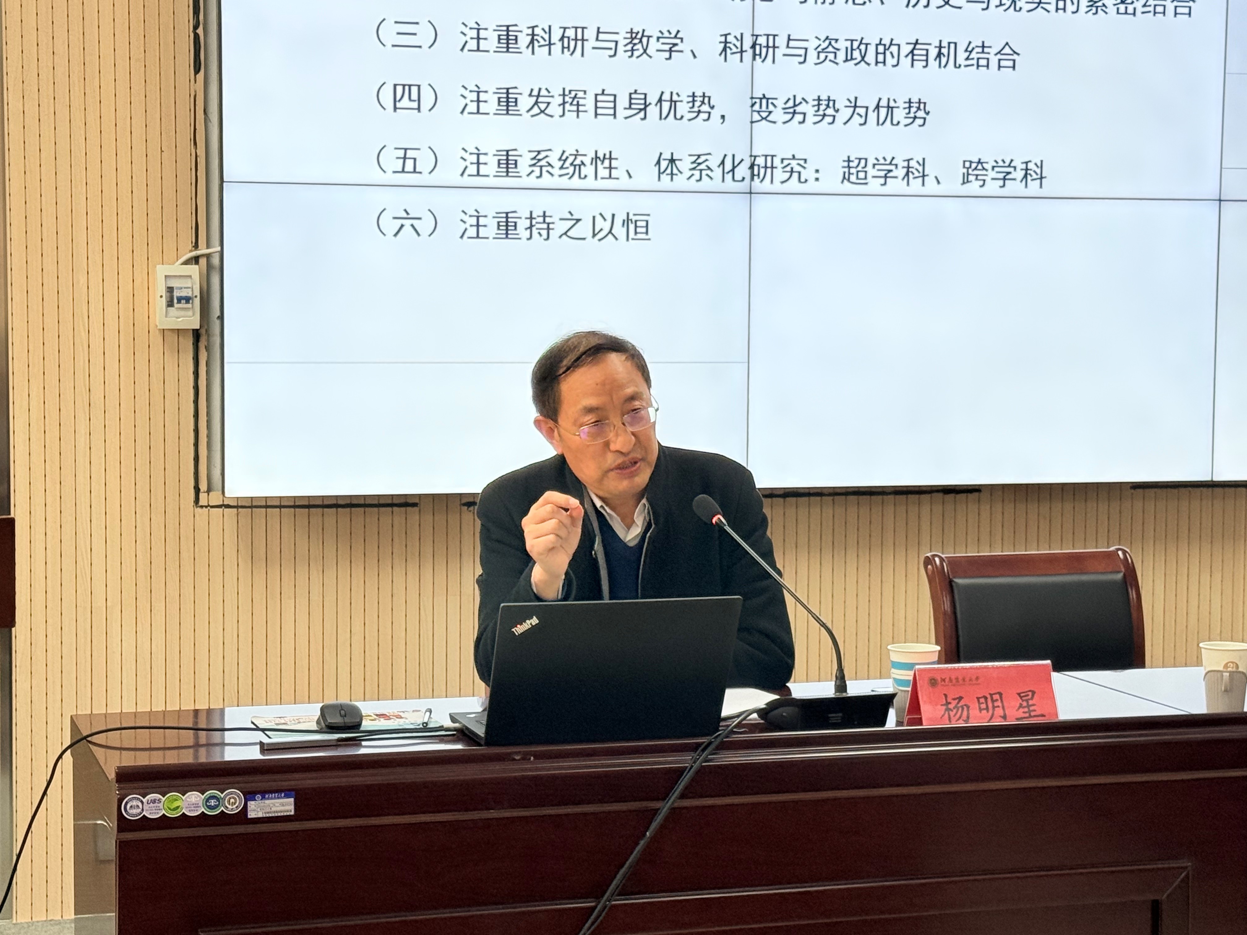 在第一场报告中,杨明星教授强调,国家社科基金项目的申报与论证,需充分考量对新兴前沿交叉学科建设、咨政建言及人才培养(即教学工作)的影响与带动作用。结合自身申报经验,他从六个“注重”展开讲解:注重跨学科研究;注重理论与实践、动态与静态、历史与现实的紧密结合;注重科研与教学、科研与咨政的有机统一;注重发挥自身优势,实现劣势向优势的转化;注重系统性、体系化研究,强化超学科与跨学科融合;注重持之以恒推进研究。