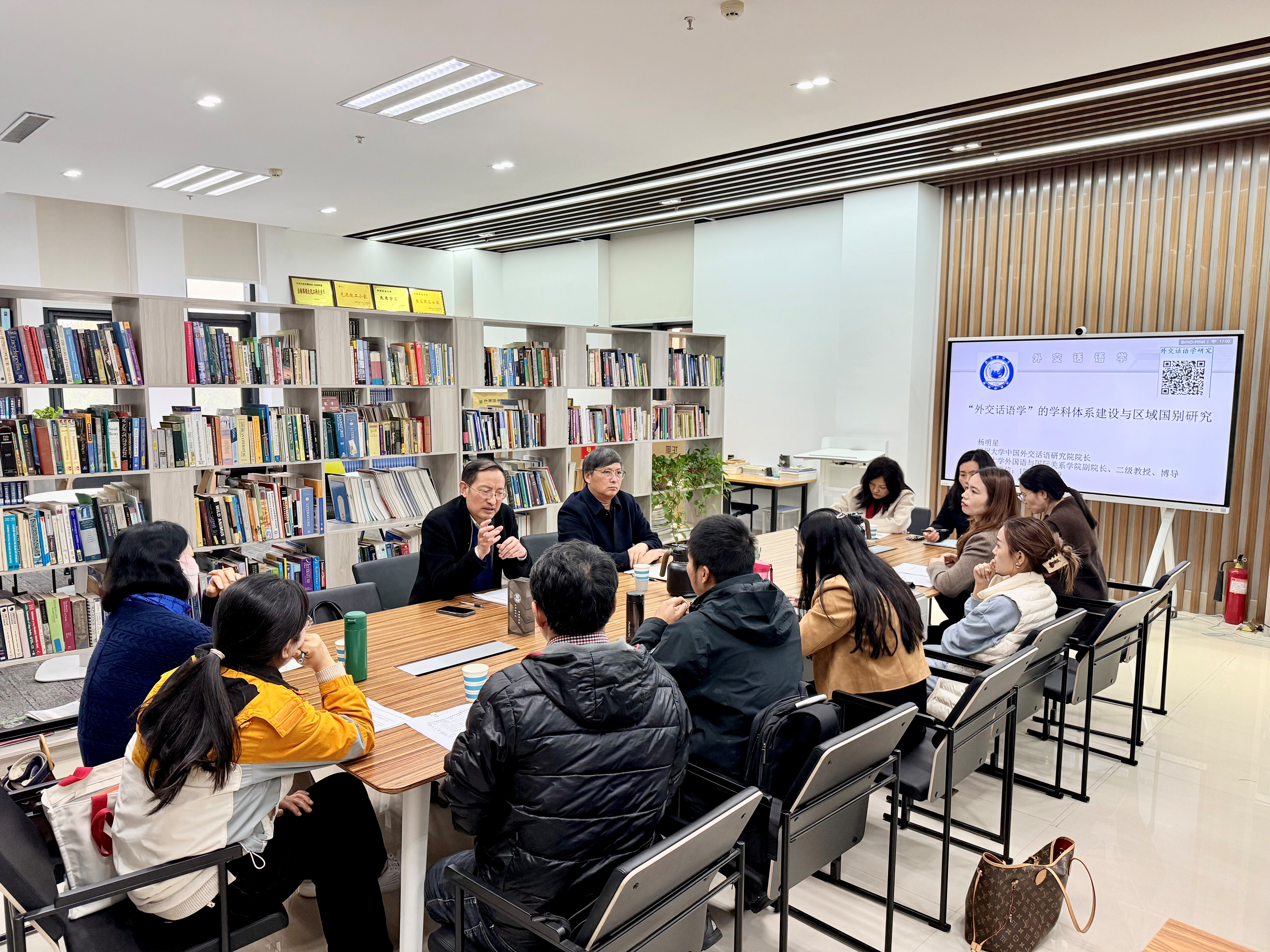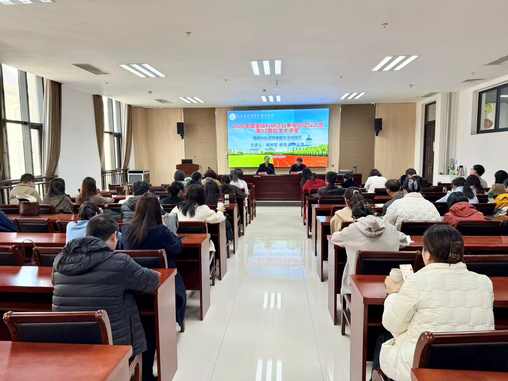 特别邀请郑州大学二级教授、中国外交话语研究院院长杨明星,作了题为“国家社科基金项目申报方法及技巧”与“‘外交话语学’的学科体系建设与区域国别研究”的两场专题报告会。报告会由院长张俊杰教授主持,党委书记王燕萍带领全院博士、在读博士及教师代表参会。