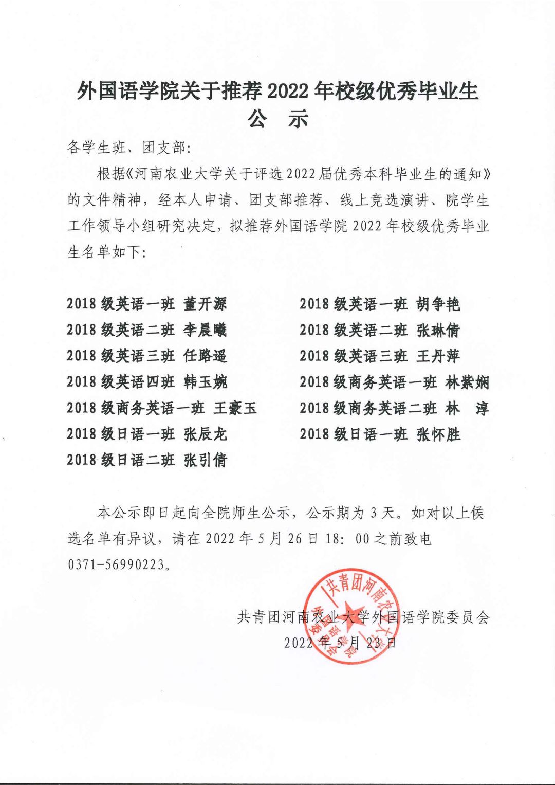 东京热在线 关于推荐2022年校级优秀毕业生公示