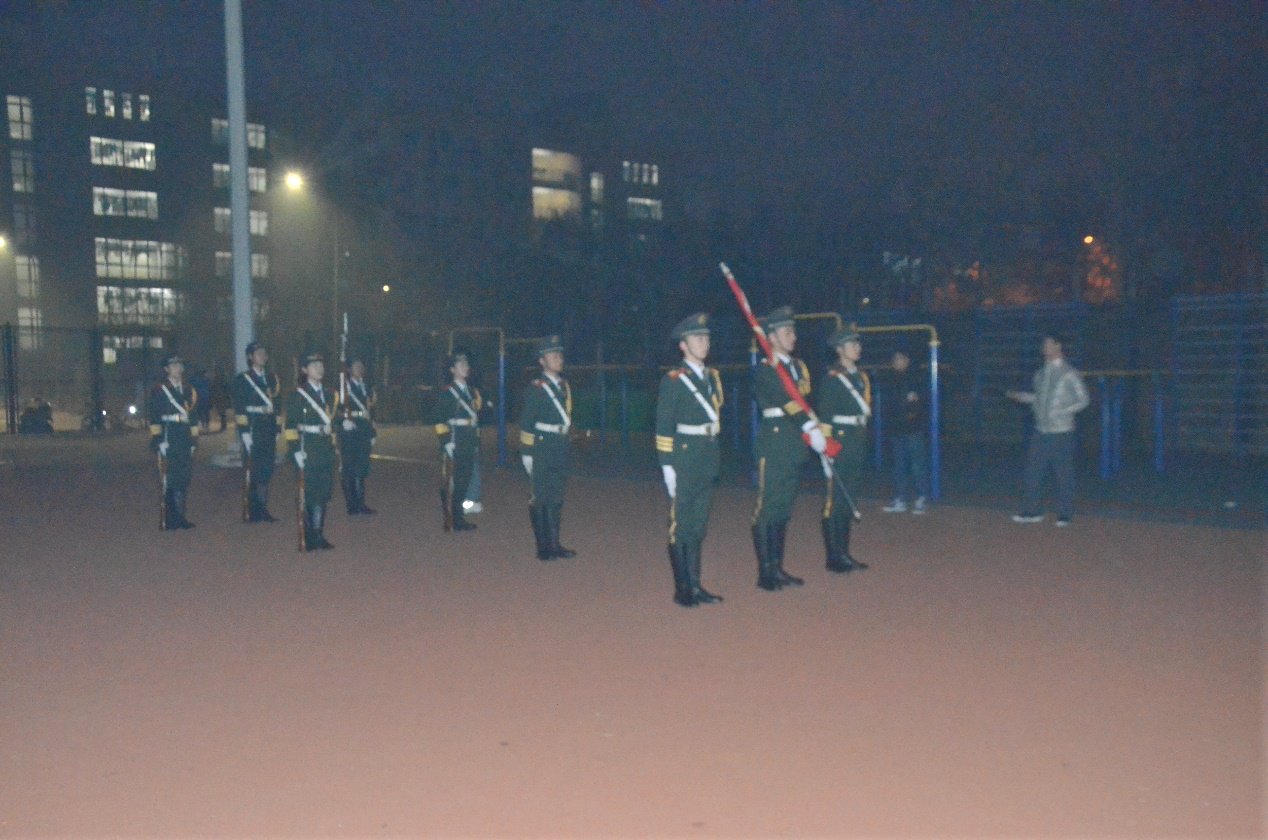 上午七点,在全院师生的注视下,国旗护卫队昂首挺胸,护卫着国旗,齐步走向国旗台。伴随着慷慨激昂的国歌声,升旗手振臂一挥,五星红旗冉冉升起,迎风飘扬,全体新生仰望注视,高声齐唱国歌。