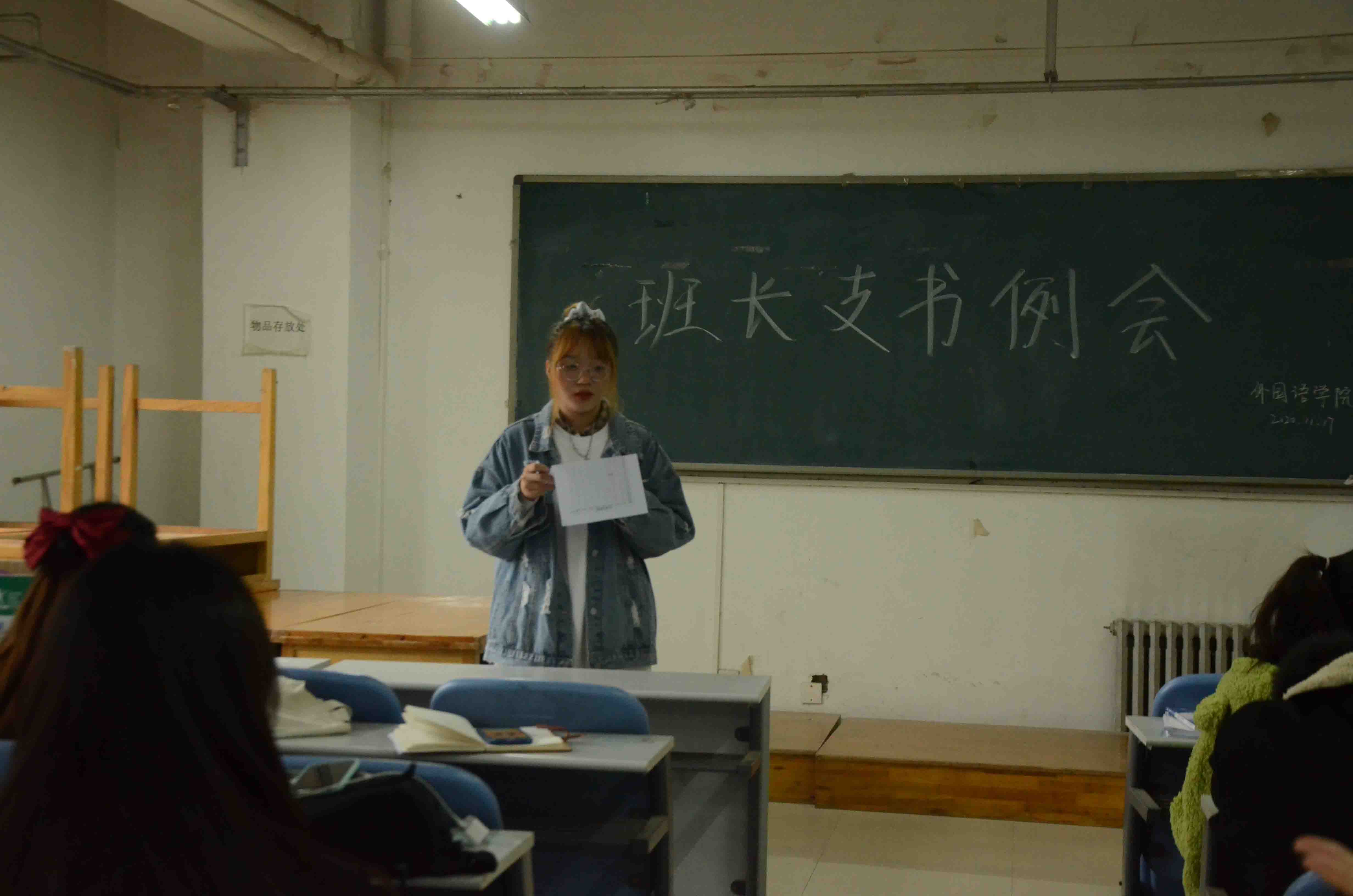 青年大学习中的表现提出表扬,并就相关团员推荐问题强调了思想认识的重要性,希望各班长支书加强对同学们的思想正确引领,使其在组织上更在思想上入党入团;随后,社团部对餐厅值班活动进行了总结并对即将到来的冬至与文化周末晚会相关工作进行了安排,她鼓励各班同学踊跃报名,发挥专业优势,积极进行节目创新;针对上周进行的消防演练活动,生保部提醒各班长支书要积极引导班级同学提高安全意识,注意宿舍用电等安全问题,将理论知识运用到实践中去,防患于未然;会议最后,学实部负责人传达了专四模拟考试的通知,提醒同学们认真对待,按时到场,诚实守信,并预祝大家取得出色成绩。