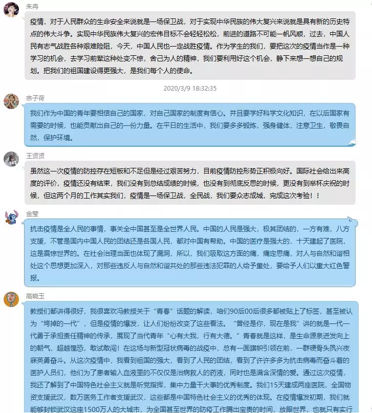 思政课结束后,在班主任的带领下,各班学生充分交流分享学习感悟。大家纷纷表示:“疫情无情,但大爱无疆;多难兴邦,中华民族会砥砺前行。少年强则国强,少年独立则国独立,作为祖国的未来,民族的希望,更应该担负起新时代青年人的责任,明确心中理想,为中华民族的伟大复兴献出自己的一份力量。没有一个冬天不能逾越,没有一个春天不会来临,让我们团结一心、众志成城,一起等待春暖花开。”
