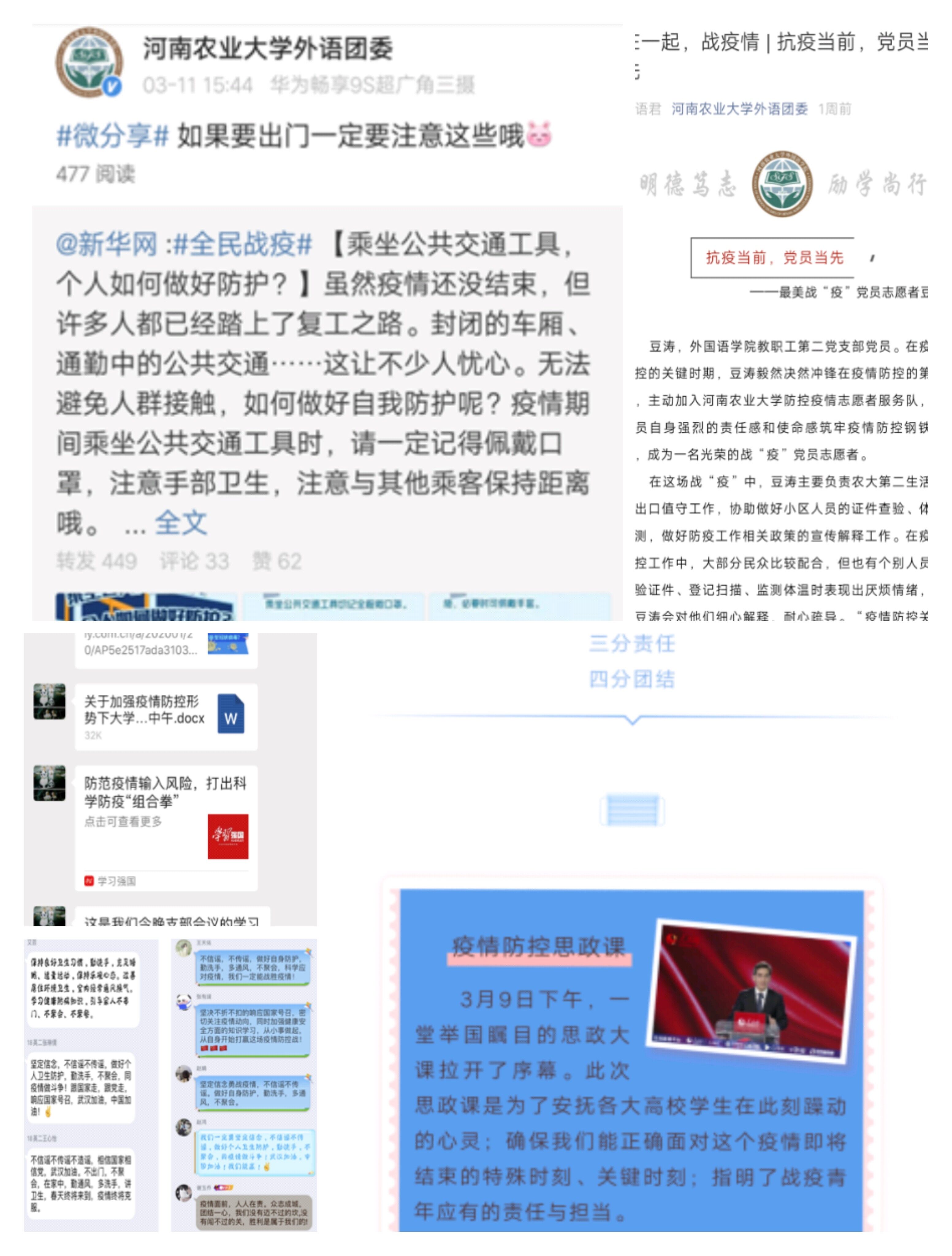 有效利用网络资源,通过QQ群、微信、学习强国、青年大学习等平台组织学习防疫知识,引导学生理性认识疫情,做好科学防护。分享战“疫”事迹。通过分享18MTI陈亚婷、18英二申子辰等东京热在线