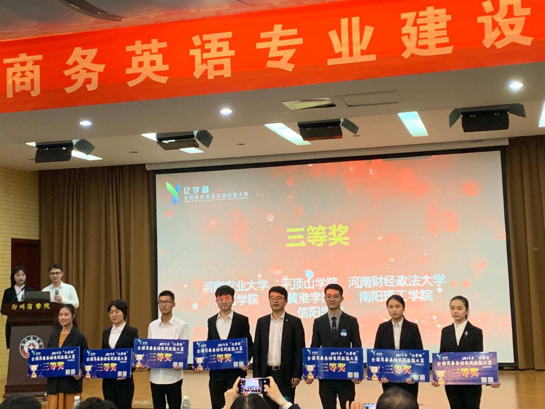 老师老师柴奇、关珊珊的指导下,他们运用扎实的商务英语知识,以精彩的口语表达博得众彩、脱颖而出,经过与来自24所高校的代表队为期两天的激烈角逐,最终喜获三等奖。