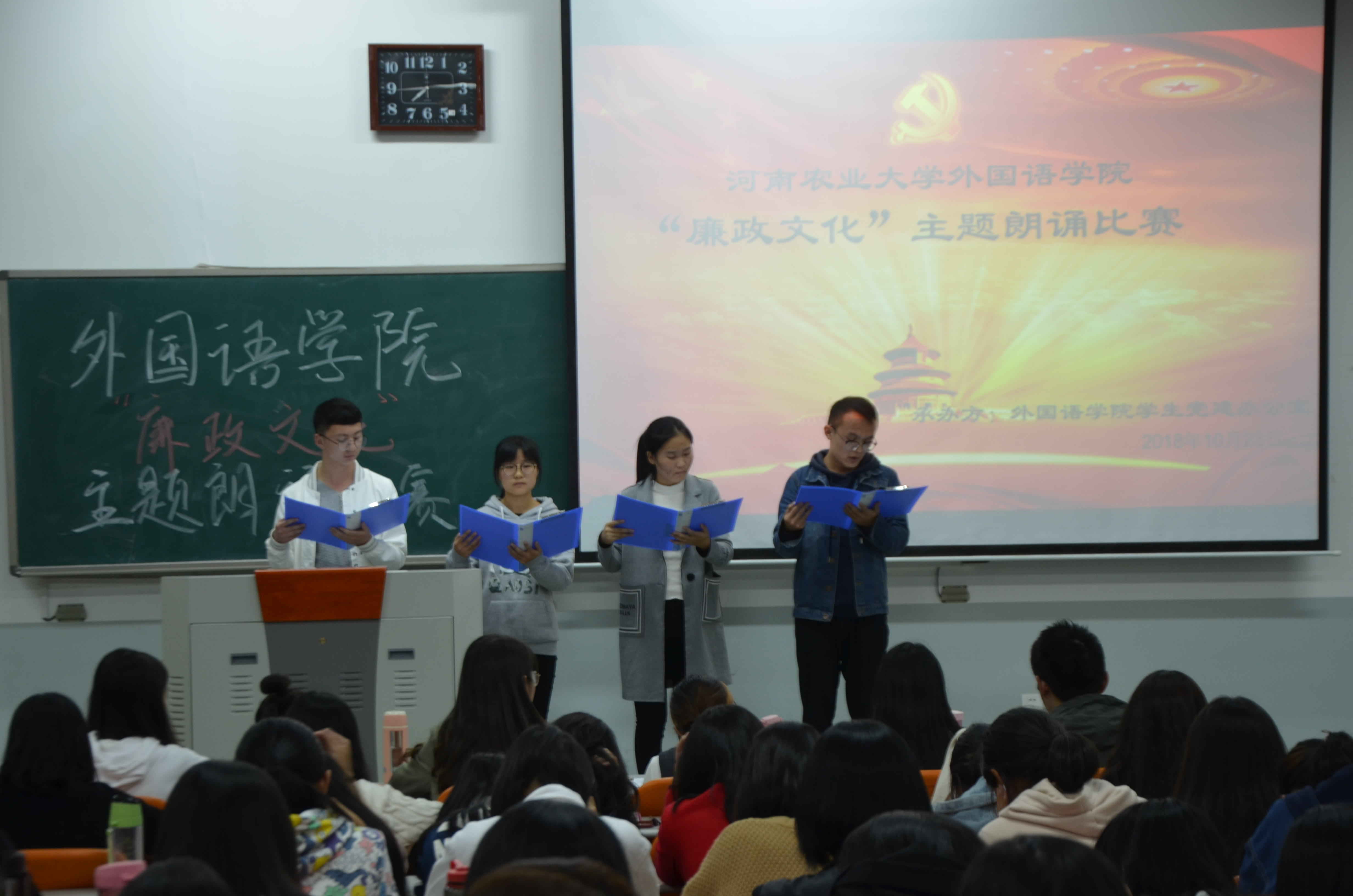 于龙子湖校区繁塔楼教室C406举办了“廉政文化”主题朗诵比赛。本次比赛由主要学生干部担任评委。