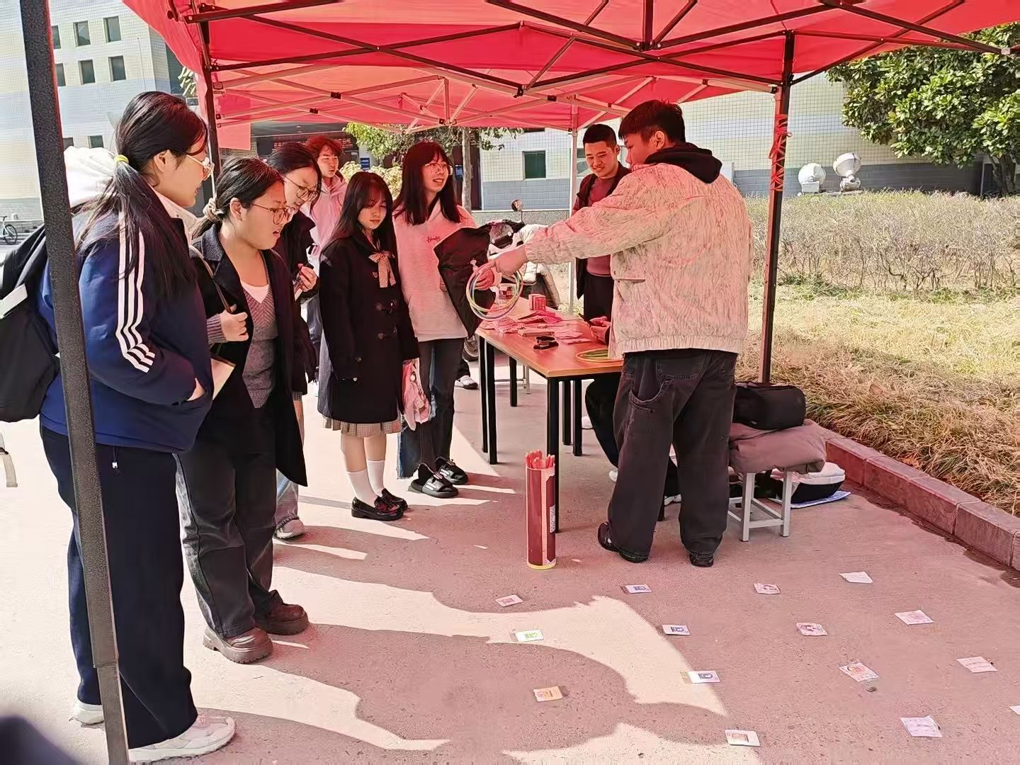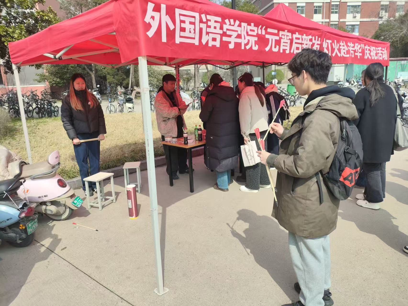 本次活动以经典民俗游戏为核心,设置猜灯谜、投壶、套圈三大互动环节,形式新颖、参与性强,现场热闹非凡、暖意融融。猜灯谜区的谜题融合中华传统文化、外语专业知识与校园生活,同学们或独自思索或结伴探讨,在解谜中收获乐趣、感受知识交融的魅力;投壶区里,大家有序投掷,沉浸式体验传统雅趣,在比拼中增进同窗默契;套圈区前,同学们瞄准礼品轻巧投掷,套中的喜悦让现场欢呼声不断。整场活动秩序井然、氛围热烈,同学们在民俗体验中欢度元宵,既缓解了新学期学习压力,又拉近了彼此距离。